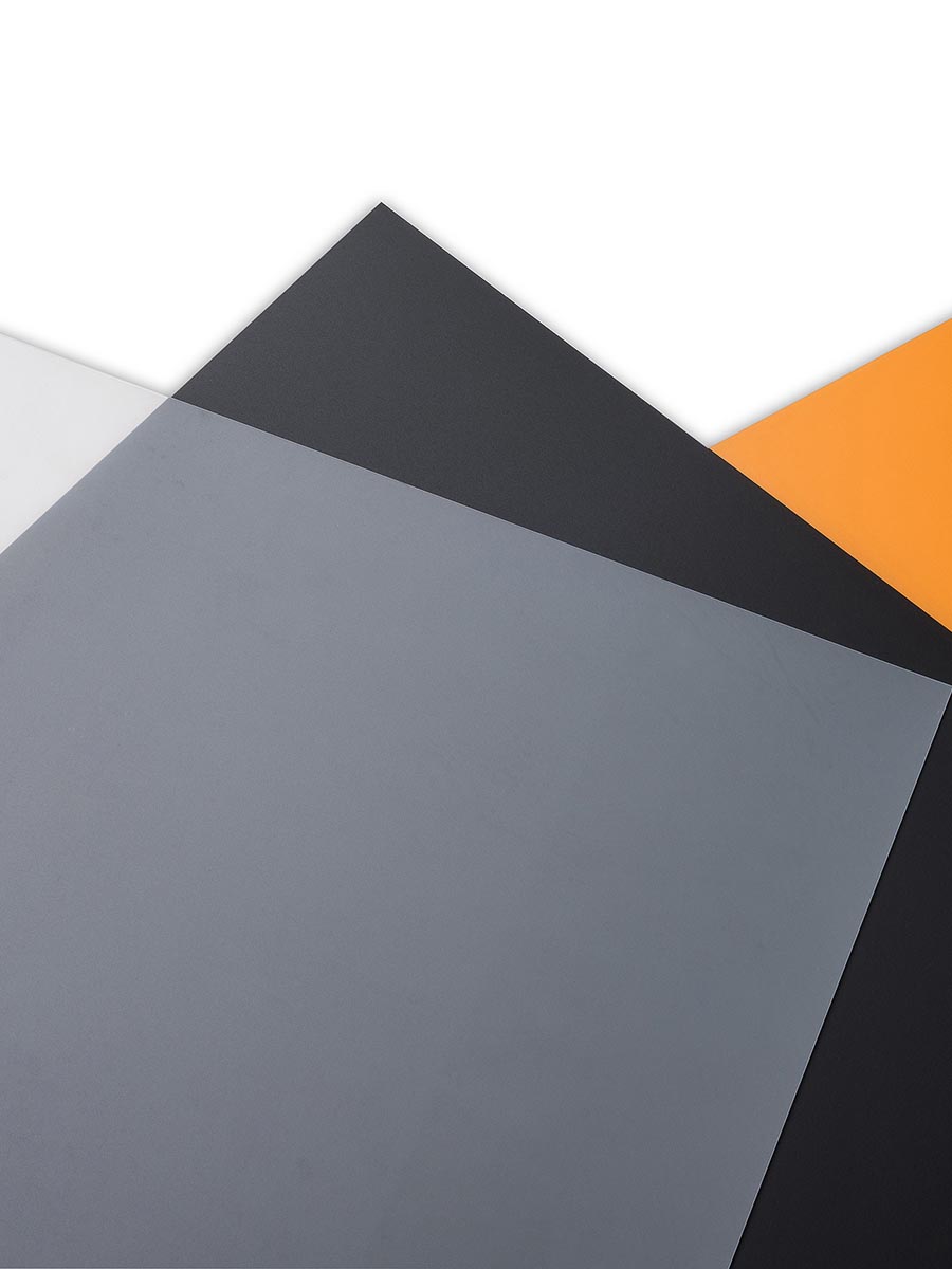 Izredno tanke in lahke polne polipropilenske plošče. Na voljo v prosojni nevtralni in oranžni barvi ter neprosojni črni barvi. Debelina plošč 1 mm, dimenzije 50 x 35 in 70 x 50 cm. Dobro odporne na praskanje. Primerne za notranjo uporabo. Pogoste vrste uporab: